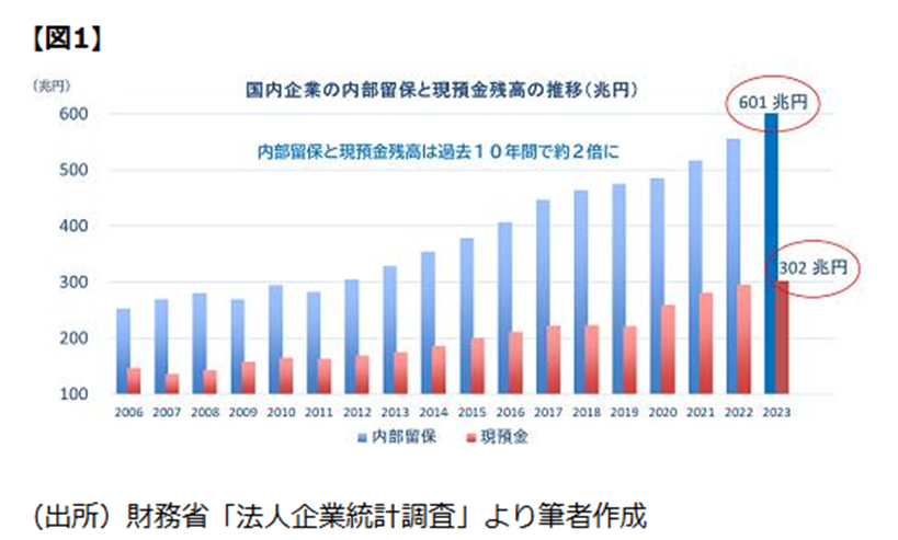 ただし、実質賃⾦は依然としてマイナスであり、またトランプ関税の影響や⽶中対⽴、中国経済の減速懸念など、不安材料も多く、⽇本経済は今まさにデフレ脱却の岐路に⽴っていると⾔えるでしょう。この⻑期にわたるバランスシート不況の中、過剰債務の圧縮やコスト削減を優先してきた⽇本企業の「守りの経営姿勢」は基本的に変わっておらず、リスクテイクを回避し、キャッシュフローを内部に滞留させる⾏動様式が続いてきました。その結果、⽇本企業の内部留保は2023年度に約600兆円と、名⽬GDPに匹敵する規模まで膨れ上がり、その半分の約300兆円が現預⾦で保有されている状況にあることは、これまでも指摘されているところです。