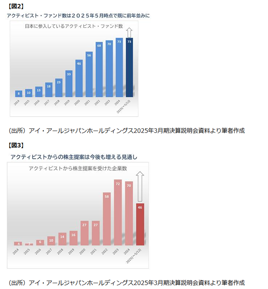 しかしながら、⽇本企業が⻑年コツコツと積み上げ、温存してきた貴重な内部留保やキャッシュを、アクティビスト・ファンドからの株主還元要請に従って配当や⾃社株買いの原資に充てるのか、それとも将来の成⻑に向けて、新規投資やM&A(合併・買収)資⾦、研究開発、⼈的資本投資などに回すのか、企業は、当然ながら、効率的な資本の活⽤⽅法について、真摯に検討し、最善の経営判断を株主に訴求していく必要があります。