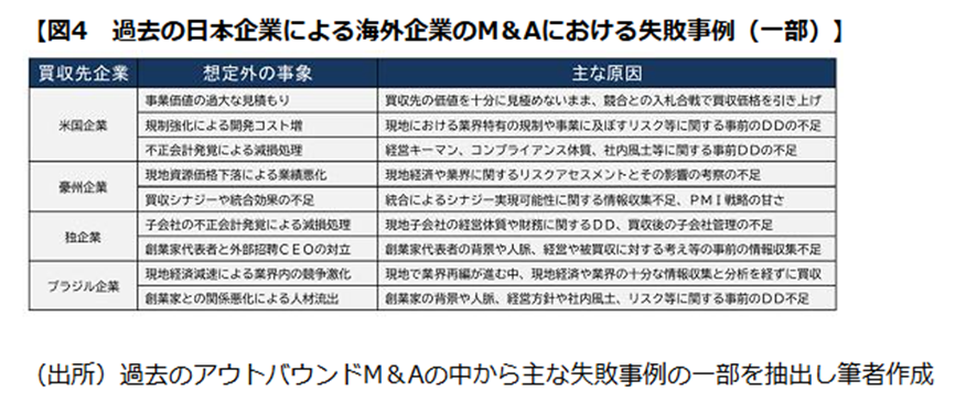 くまとめると、①現地経済や法規制、業界のアセスメント不⾜、②買収先の創業者や経営陣、社員、⽀配株主などの「⼈」に関する情報収集と分析の不⾜、の2つに概ね集約されます。