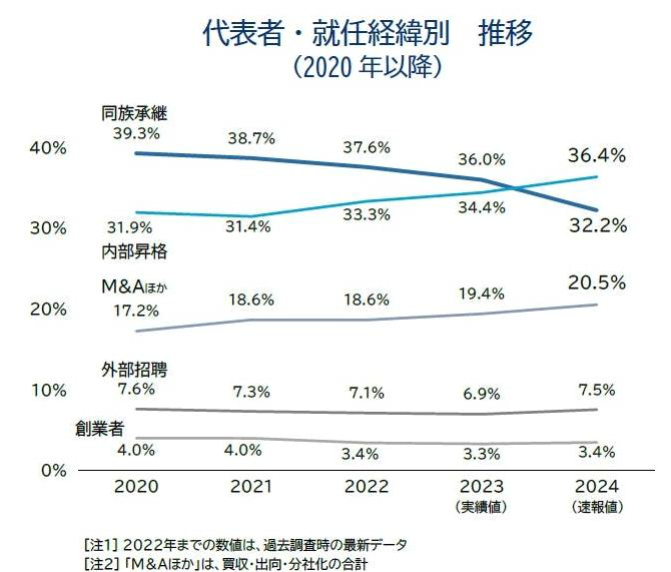 実際に、帝国データバンクが 2024 年11 月 22 日に発表した『全国「後継者不在率」動向調査(2024 年)』においても、“事業承継で「脱ファミリー化」が加速、後継候補に「ベテラン」求める志向が強まる”として、▼これまで身内の登用など親族間承継から社内外の第三者へと経営権を移譲する動きが加速していること、▼2024 年は買収や出向を中心にした「M&A ほか」、社外の第三者を代表として迎える「外部招聘」など、社外の第三者を経営トップとして迎え入れる事業承継の割合増加傾向が続いたこと――が示されています(上記図(『全国「後継者不在率」動向調査