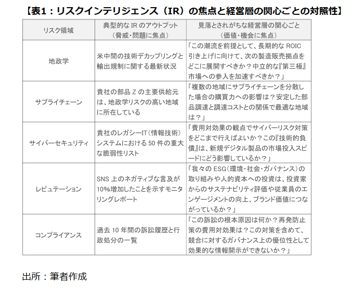 まず、多くの企業経営層が抱いているであろう1つの素朴な疑問の話から始めたい。それは、「なぜ、リスク報告は経営に響かないのか︖」という問いである。企業のさまざまなリスクを洗い出す、いわゆるリスクインテリジェンス(RI)は、例えば、コンプライアンス⾯での懸念事項、ネガティブな⾵評、サイバー脅威、サプライチェーンの脆弱性といった事象の特定と分析において専⾨性を発揮する。しかし、こうしたリスクにフォーカスした視座は、企業の防御において不可⽋といえるものの、経営層が求める価値創出を重視する視座とは、多少、認識上の距離感があるように思われる。