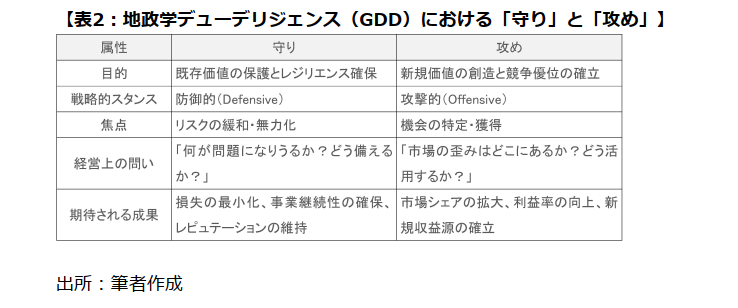 GDDにおける「守り」と「攻め」は、地政学戦略というコインの裏表であり、相互に補強し合う好循環を形成する。そして、その関係性において、強固な「守り」の実践は、成功裏に「攻め」を遂⾏するための不可⽋な前提条件となる。両者の因果関係は明確である。まず、「守り」のプロセスは、単にリスクを特定するだけでなく、地政学的な環境の「地形図」を描き出す。どの地域が不安定化し、どの国が主要なパートナー国と連携を深め、どの政策が新たなイ