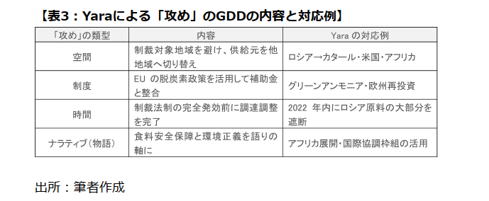 以上のYaraの動きは、地政学的制約の単なる「回避」ではなく、制度・時間・空間の多層的な「攻め」を伴う戦略的な再編成を伴うものといえる。具体的には、下表のとおりである。