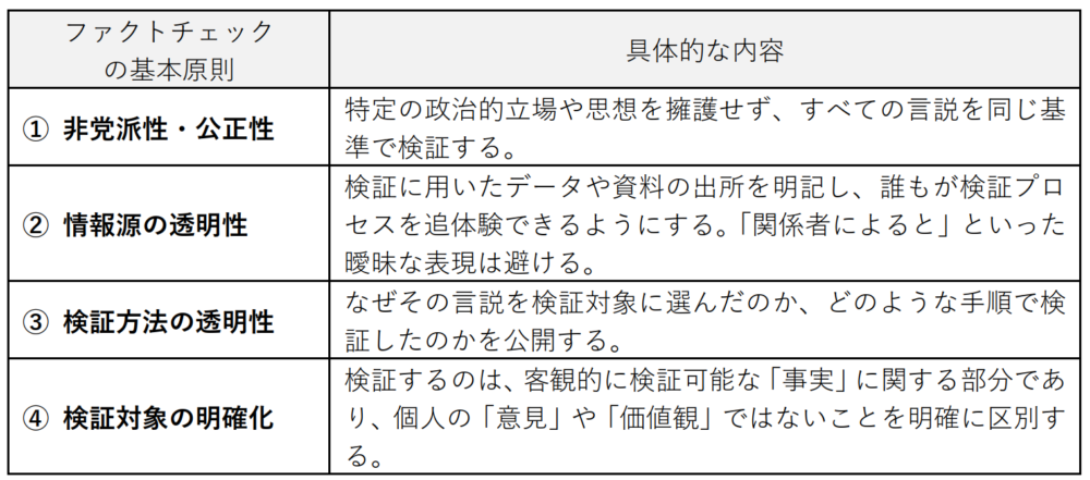 信頼できるファクトチェックは、国際的な原則(国際ファクトチェックネットワーク綱領)に基づいており、その柱は「透明性」と「公正性」です。