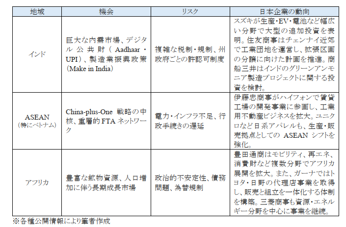 「投資⽴国」としての⽇本の成⻑を持続させるには、インド、ASEAN、アフリカ、南⽶といった、いわゆるグローバルサウス戦略的な投資の分散が不可⽋といえます。ただし、これらの国・地域は⾼い⼈⼝成⻑率と潜在需要を有する⼀⽅、制度的・政治的リスクも併存しており、機会とリスクを精緻に⾒極めた投資戦略が不可⽋です。