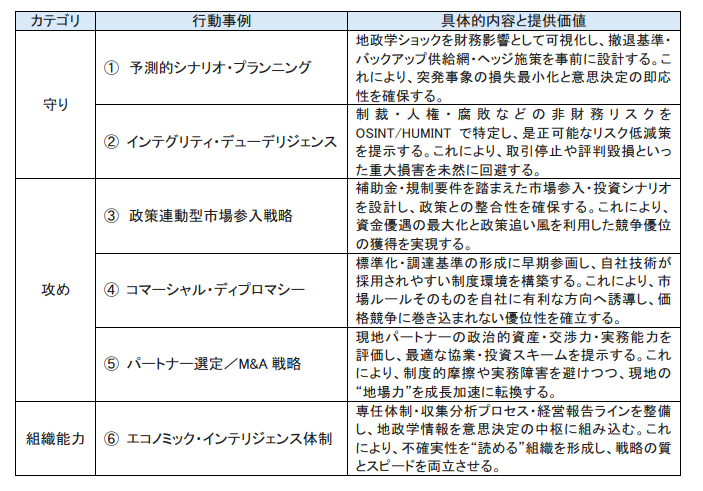 こうした環境下では、国際社会における「力の論理(Realpolitik)」を冷静に認識することが不可欠です。それは、不確実性に怯えて行動を抑制することではなく、変動がもたらす競争条件の再編を読み取り、どこに実行可能な成長機会が生まれるのかを見極めるための前提条件となります。この文脈において、日本企業に求められるのは、「守りのインテリジェンス」によるリスク回避にとどまらず、機会創出を視野に入れた「攻めのインテリジェンス」へと軸足を移すことです。米国の産業政策を前提とした戦略的投資、グローバルサウスにおける制度・市場形成への関与、戦略的 M&A といった選択肢は、いずれも不確実性を前提としつつ、明確な成長余地を内包しています。