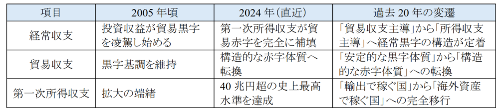 周知のとおり、⽇本経済は、2005年頃を境として、明治維新や戦後の⾼度経済成⻑期に⽐肩する構造的転換を遂げました。かつて「加⼯貿易」によって国富を築いた「貿易⽴国」の時代は幕を閉じ、代わって定着したのが、海外に構築した⽣産拠点や資産から得られる資本収益によって富を維持・拡⼤する「投資⽴国」モデルです。