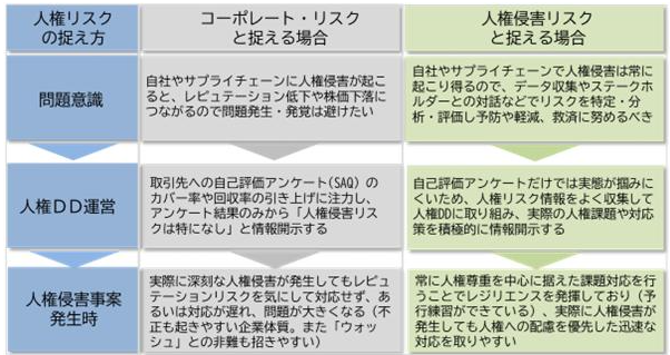 【図表2 ⼈権リスクの捉え⽅に基づく考え⽅や取り組みの違い】
