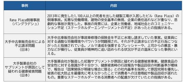 また、⼈権侵害を隠蔽するために、不正が⾏われるケースも少なくありません。⼈権尊重の取り組み(特にステークホルダーエンゲージメント)が⾏われておらず、⼈権意識が希薄あるいは⽋如しているような企業は、⼈権侵害や企業不正が起こりやすい企業カルチャーといえるでしょう。実際に、これまで企業における⼈権意識の⽋如がもたらした企業不正事例は枚挙にいとまがありません。