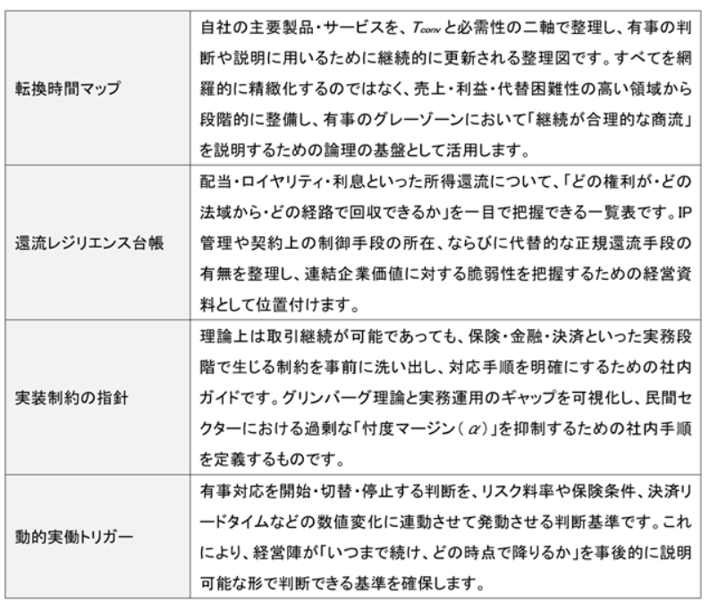 ここで日本企業が理解すべき重要な点は、台湾有事は「取引が自動的に止まるイベント」ではなく、「取引を継続する場合の説明責任が急激に重くなるイベント」であるという点です。Tconvが十分に長い「遅延転換品」である場合、取引継続が検討され得る余地は残りますが、それは常に説明可能性(当局・取引先・金融物流に対する説明)を伴う必要があります。