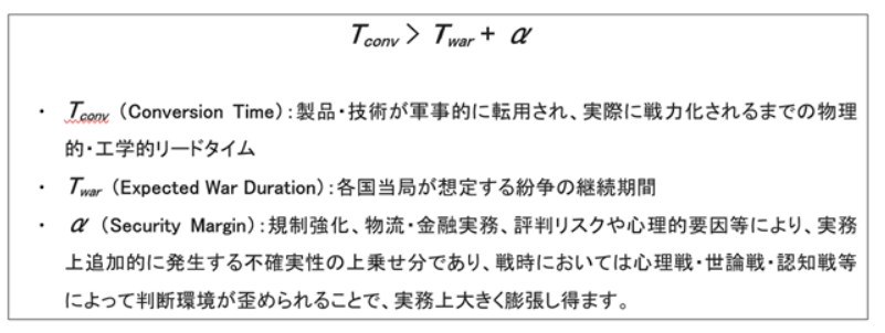 - 行政側のマージン:安全保障当局は、不確実性を嫌い、理論値よりも大きなαを設定する傾向があります。企業に求められる主体性とは、工学的・実証的根拠を用いてTconvの性質を説明し、判断材料を提供することにあります。